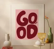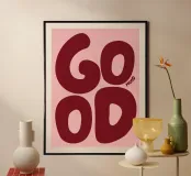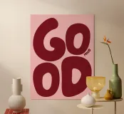 GOOD MOOD A clear typographic statement in large letters. Modern, timeless and full of positive energy. This design sets a strong accent and brings lightness and a good mood to any room - perfect for living rooms, offices or creative spaces. Colours: pink / red