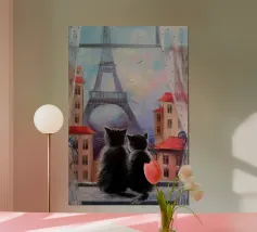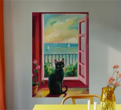 Two black cats sit silhouetted in an ornate, arched window, gazing out at a starry night sky with a full moon, creating a magical and gothic scene.
