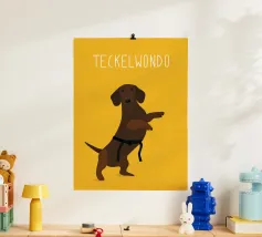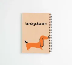 The motif shows a cute orange dachshund with the humorous text "Herein gedackelt" on a beige background. Designed in warm orange and brown tones, the image combines humour and charm in a charming way. A playful, minimalist illustration that will brighten up any entrance area with a smile.