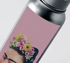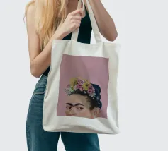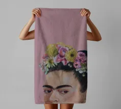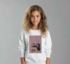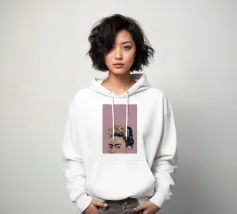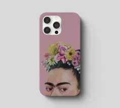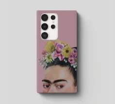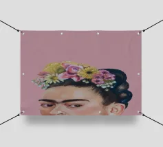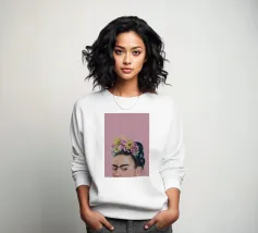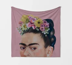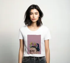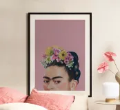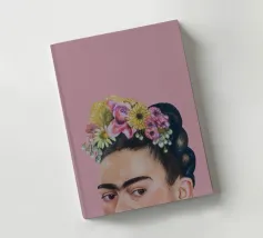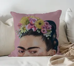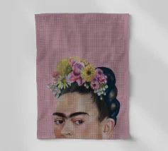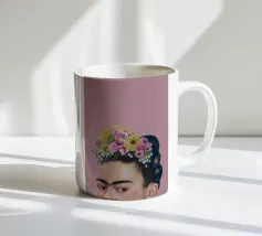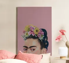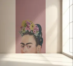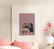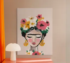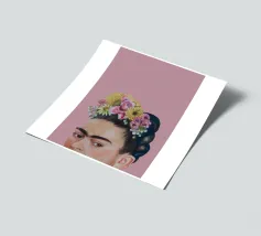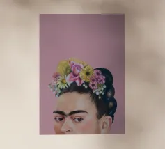 Dieses charmante Portrait von Frida Kahlo, umgeben von einem hellen-pink Hintergrund, fängt ihren einzigartigen Humor und die Essenz der mexikanischen Kultur ein. Die minimalistische und florale Illustration bringt einen modernen, kreativen Touch in jeden Raum und feiert gleichzeitig die zeitlose Schönheit ihrer Kunst