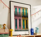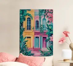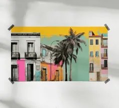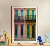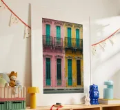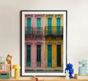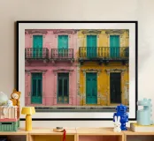 In this image, Havana’s architectural beauty is on full display. Featuring a row of colorful colonial-style facades painted in shades of pink, teal, and yellow, the scene radiates life and energy. The finely crafted iron balconies are emblematic of the city’s rich cultural history, while the worn textures and chipped paint lend authenticity to the vibrant surroundings. This artwork evokes a sense of nostalgia for Havana’s past and its unique fusion of elegance and decay.
