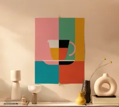 A minimalist still life capturing a quiet moment of warmth and care. Soft brushstrokes and layered hues of peach, coral, and gentle green surround a simple striped cup, evoking calm, presence, and tenderness. This artwork reflects a pause in time — a small, comforting ritual held with intention. Ideal for modern, Scandinavian, or cozy contemporary interiors.