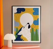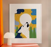 Enjoy a vibrant wildlife illustration featuring a wolf howling at the moon with trees and stars in the background.