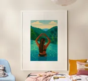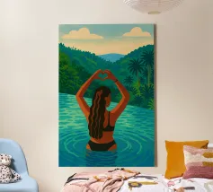 Bring serene tropical vibes into your space with this vibrant art print featuring a woman standing in an infinity pool, hands forming a heart against a lush jungle backdrop. Inspired by gouache and acrylic styles, this illustration blends nature and feminine elegance in warm, earthy tones. Perfect for modern interiors, wellness spaces, or as a thoughtful gift for travel and self-love enthusiasts.