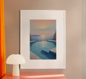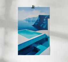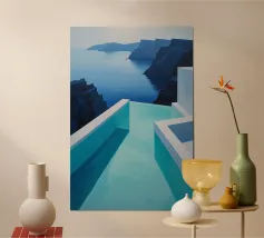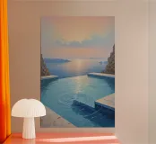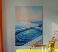 This surreal oil painting showcases an infinity pool capturing the reflection of a breathtaking sunset. The vibrant yet soft tones of the sky are mirrored in the pool’s crystal-clear water, creating a cohesive and peaceful scene. The surrounding landscape features distant islands bathed in the gentle evening glow, adding depth and serenity to the composition. The smooth ripples and the precise textures of the pool elevate the painting into a tranquil masterpiece, celebrating the unity between nature and artistic expression.
