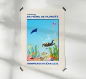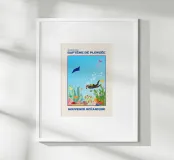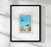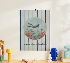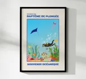 Dive into the deep blue with this captivating scuba diving poster! This colorful illustration features a diver exploring a vibrant coral reef, surrounded by tropical fish, a majestic manta ray, and a jellyfish. It's the perfect ocean souvenir for sea lovers and diving enthusiasts. This retro print brings the beauty of the underwater world to your home. A fantastic travel lover gift that adds unique coastal decor and a splash of adventure to any room! Scuba diving print, Coral reef art, Ocean souvenir, Underwater illustration, Marine life poster, Tropical decor, Retro diving, Manta ray art