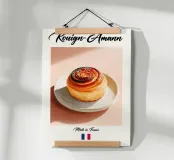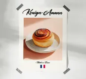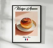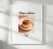 Mouthwatering illustration of a golden, caramelized kouign-amann pastry on a simple plate, framed by elegant lettering and a small French flag on a soft peach background. This charming kitchen print brings authentic French bakery vibes to your home and adds a warm, gourmet touch to your walls.