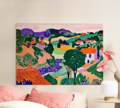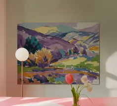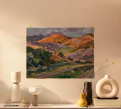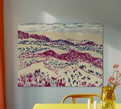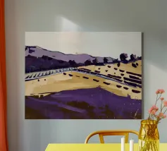 Loose, bold strokes in ochre and violet form a rhythmic, modernist take on cultivated hills and distant ridgelines. The sweeping repetition of rows and trees creates a feeling of both order and openness—an abstract homage to agricultural landscapes at dusk.