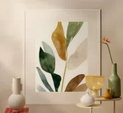 A minimalist botanical composition painted in watercolor, featuring broad, organic leaf shapes in deep greens, golden ochre, soft beige, and earthy browns. The fluid transparency of each form evokes a sense of calm, ideal for nature-inspired and contemporary interiors.