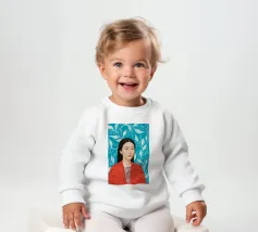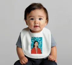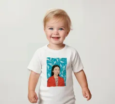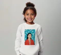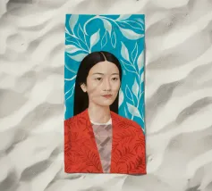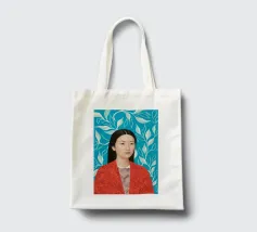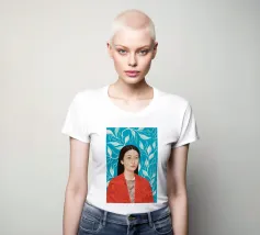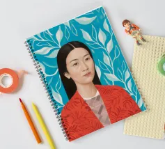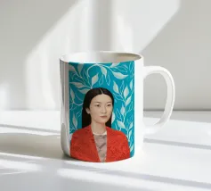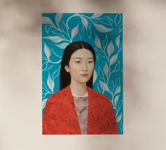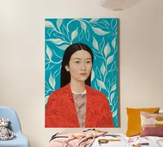 This artwork shows a person with long, dark hair wearing a red shirt. The background is filled with blue and white leafy patterns, creating a tranquil and peaceful atmosphere.