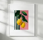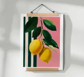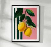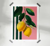 Two sunlit lemons hang from a glossy green branch against a rosy pink background with bold green and white stripes. A fresh citrus print that brings Mediterranean energy to kitchens dining rooms and cafés. Perfect for breakfast nooks and summer homes. Easy to pair with white tile brass fixtures natural wood and deep green accents.