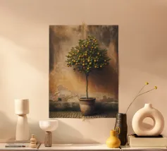 A painting of a lemon tree in a terracotta pot against a light blue background. The tree is full of ripe yellow lemons and green leaves.