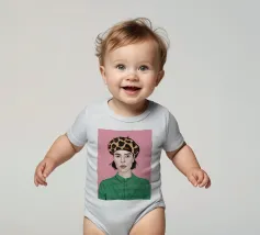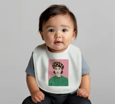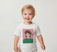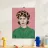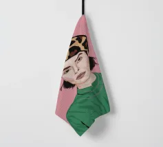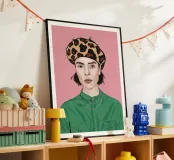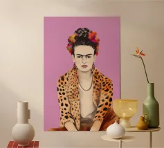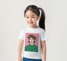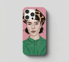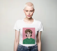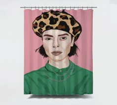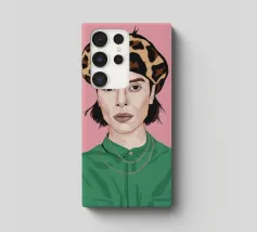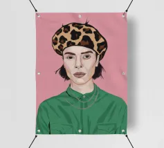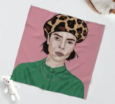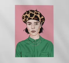This artwork depicts a person with short hair wearing a leopard print hat and a green shirt. The background is pink, highlighting the graceful and stylish appearance of the subject.