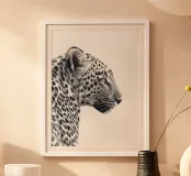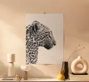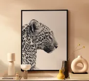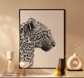 Dieses kraftvolle Motiv zeigt das Profil eines Leoparden in einer detailreichen Schwarz-Weiß-Aufnahme. Die feinen Fellstrukturen und die ausdrucksstarken Augen betonen die Eleganz und Stärke dieses faszinierenden Raubtiers. Ideal als Wandbild, Kissen oder Handyhülle, um jedem Raum eine dynamische und exotische Atmosphäre zu verleihen. Perfekt für Liebhaber von Wildtieren und moderner Naturfotografie, die sich ein Stück der Wildnis ins Zuhause holen möchten