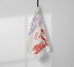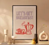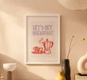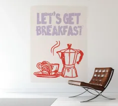 The picture shows a stylised illustration of a breakfast scene. At the bottom is a red line drawing of a moka pot, a cup of coffee and a plate with a croissant. Above this illustration is the text "LET'S GET BREAKFAST" in large, playful purple letters. The background is a light cream colour and is framed by a simple border. The overall design conveys a cheerful and inviting message that is ideal for promoting breakfast or coffee themes.