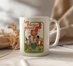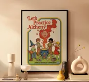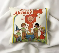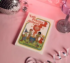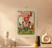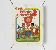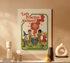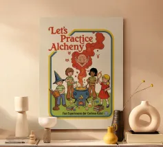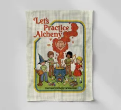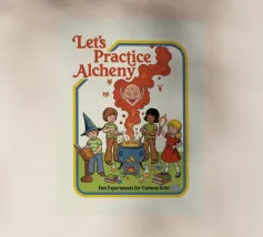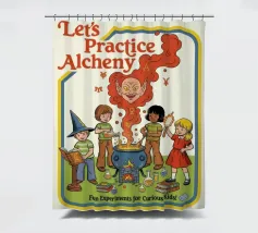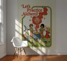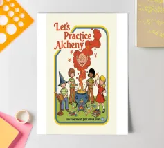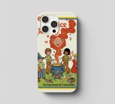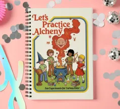 Kids experimenting with potions in a retro educational book style. A funny blend of innocent childhood nostalgia and dark fantasy alchemy.