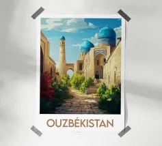 Affiche de voyage illustrant les ruines antiques de Leptis Magna en Libye, avec ses colonnes romaines et ses arcs majestueux sous un ciel clair. Une illustration murale idéale pour les passionnés d’histoire, d’archéologie et de civilisations méditerranéennes. Parfaite pour une décoration empreinte de grandeur antique.