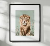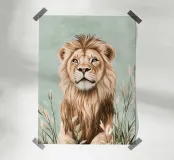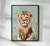 Here, the king of the savannah takes on a calm, almost meditative countenance. Surrounded by soft grasses and fine pastel foliage, he seems to observe the horizon with wisdom, as if frozen in a moment of absolute calm. This illustration combines the calm strength of the animal with the delicacy of the vegetation. The natural tones and diffused light create an elegant, contemplative atmosphere, ideal for creating a sense of stability and confidence in the space. A centrepiece for any bedroom, living room or reading corner with a natural feel.