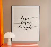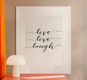 This inspiring "Live Love Laugh" motif combines modern hand lettering with minimalist elegance. The curved lines and black lettering on a white background radiate calm and positivity, making it a perfect highlight for any room. Whether as a wall mural, T-shirt, mug or cushion - this design is a reminder to fill life with love and joy. A versatile decorative element and an ideal gift for friends, family or yourself.