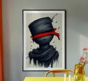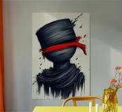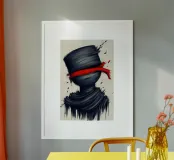 A dark, seemingly contourless figure appears to dissolve, while a bright red band covers its eyes. The rough, almost sketchy texture lends the picture a restless dynamic, as if it is about to dissolve into the background. The stark contrast between black, white and red creates an atmosphere of isolation, ignorance or a deliberate renunciation of perception. A symbol of blindness, inner turmoil and getting lost in one's own mind.
