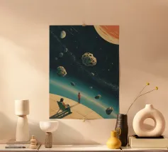 Explore cosmic serenity with the 'Moons' wooden framed art print by Scott Listfield. This modern space-themed wall art features a detailed astronaut under celestial moons, ideal for living rooms, offices, or study areas. Produced with high-quality materials, it offers durability and vibrant colours to elevate contemporary interiors.