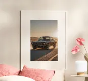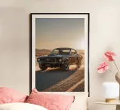 A perfectly composed cinematic shot of a matte black 1967 Ford Mustang Fastback kicking up dust as it speeds along a sunlit desert highway. The golden glow of the sunset contrasts with the deep black paint, emphasizing the sleek, aggressive lines of this legendary muscle car. The Mustang’s wide tires grip the rugged road as its V8 engine roars, exuding a raw power that defines the essence of American automotive culture. The surrounding landscape of sand and distant mountains adds to the untamed, free-spirited atmosphere.