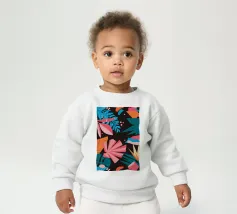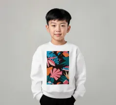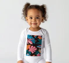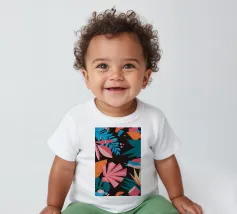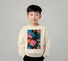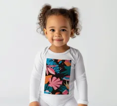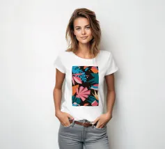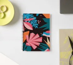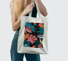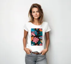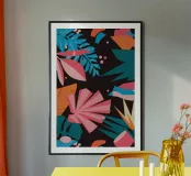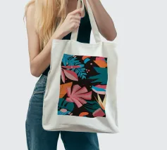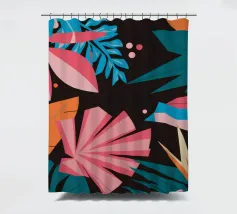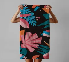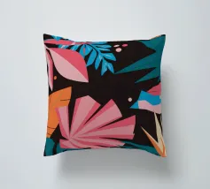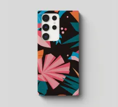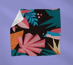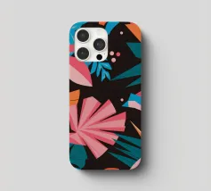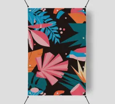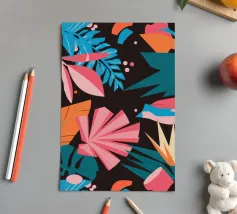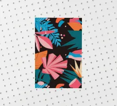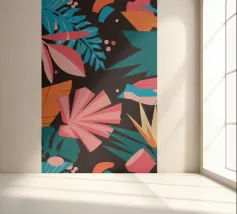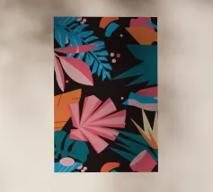 A stylish pattern of tropical leaves in shades of pink, teal, and orange is set against a dark background, evoking the lush and mysterious atmosphere of a tropical night.