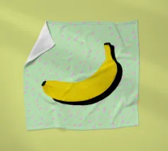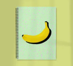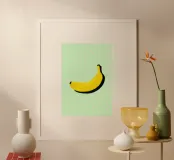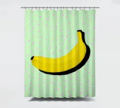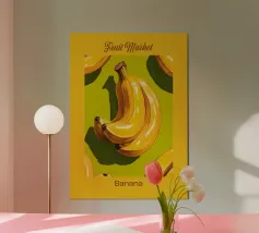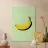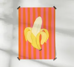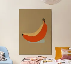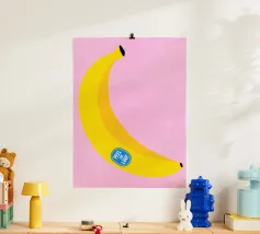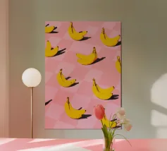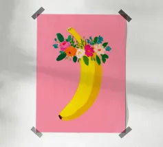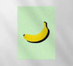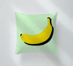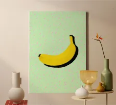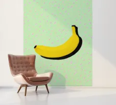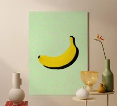 Minimalist vector illustration of a yellow banana with long hair on a light green background with pink dots. Clean black lines, simple shapes and playful style create modern, eye-catching and creative art for digital or decorative applications.