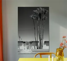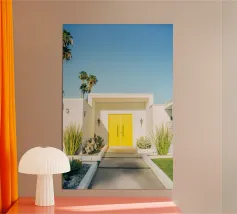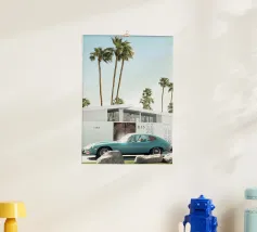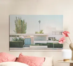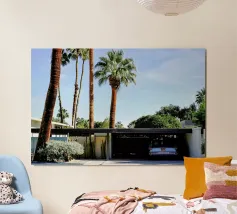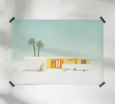 A serene art print of a modern white Palm Springs home framed by towering palm trees and desert landscaping.