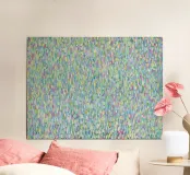 This image depicts an abstract painting characterized by a multitude of vertical brushstrokes in a diverse palette of pastel colors, including shades of blue, green, pink, yellow, and lavender. The strokes are densely packed across the canvas creating a rhythmic yet soothing visual texture that gives the impression of gentle rain or a cascade of colorful petals. The overall effect is one of serenity and subtle movement as if each stroke represents individual moments captured in time.