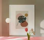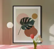 monstera leaf geometric shapes pink circle ochre circle botanical nature organic shapes plant foliage minimal design vase shape tropical theme natural elements leaf indoor plant cutout shapes negative space modern design tropical leaf decorative elements