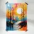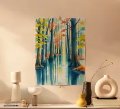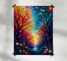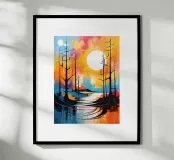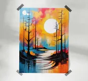 This vibrant abstract painting captures the essence of a serene landscape. A large, white moon dominates the sky, casting a soft glow over the scene. Silhouettes of trees stand tall against a backdrop of swirling colors, creating a sense of mystery and tranquility. The winding river, reflected in the moon's light, adds a touch of dynamism to the otherwise peaceful composition.