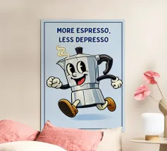 Brighten up your kitchen or coffee nook with this playful 'More Espresso Less Depresso' wooden framed art print. Perfect for coffee lovers, this vibrant design adds a cheerful touch to any wall while providing a daily dose of motivation with its witty message.