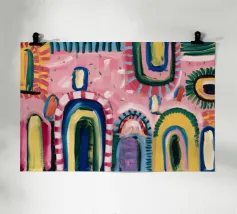 A patchwork of different patterns, including lines and U-shapes, in vibrant yellows, blues, pinks, and reds, creates a colorful mosaic effect in this abstract piece.