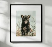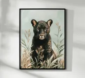 In this delicately vegetal setting, a black panther watches silently, motionless in the heart of peaceful nature. Its magnetic presence contrasts with the surrounding pastel tones, creating a subtle harmony between strength and serenity. This visual highlights the mysterious beauty of the animal, enveloped in a garden of soft foliage. A touch that's both wild and soothing, ideal for enhancing a room with character without overdoing it.