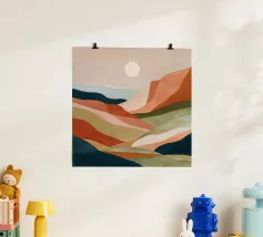 Abstract, wavy mountain shapes in terracotta, blue, and ochre tones rise under twin suns in a desert-inspired landscape.