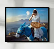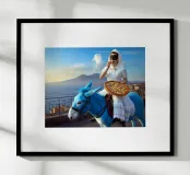 A young Pulcinella woman eats a slice of pizza while riding a blue donkey on the scenic road of Naples.
