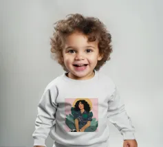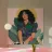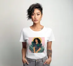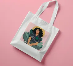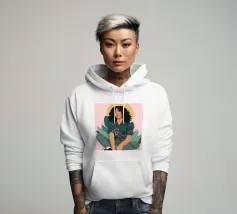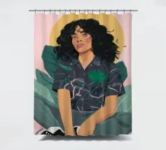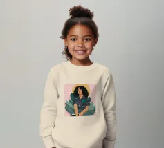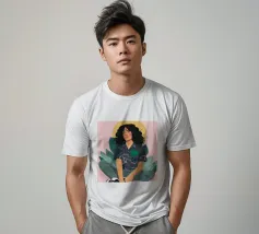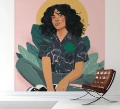 This artwork shows a person in a dark shirt with green leaves, sitting against a background of large green leaves. The scene reflects a connection with nature.