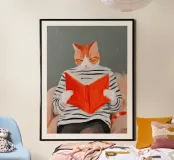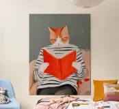 A contemplative portrait of a cat absorbed in a vivid red book, painted in soft, expressive strokes. The scene balances quiet humor with introspection, suggesting curiosity, patience, and the subtle frustration of seeking meaning. Calm and thoughtful, this artwork captures a moment where questions linger — and silence becomes part of the answer.
