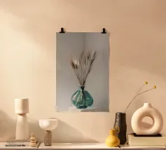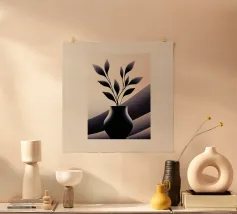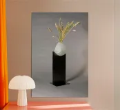 Elegant Conceptual Still Life Print! This striking image features a smooth, organically shaped white vase holding delicate white jasmine flowers, precariously suspended over a sleek, angled Z-shaped metal stand. The composition highlights the stark contrast between delicate nature and severe industrial geometry. With a minimalist aesthetic and a grey backdrop, this contemporary art print adds a touch of sophistication and balance to any modern living room or office. Conceptual Art, Still Life, Abstract, Geometry, Industrial, Balance, Minimalist, Modern Design, White Flowers, Sculptu