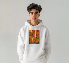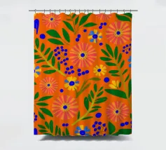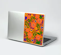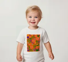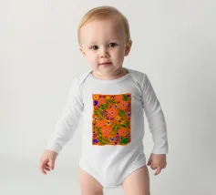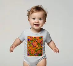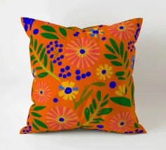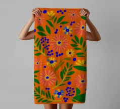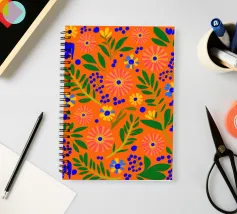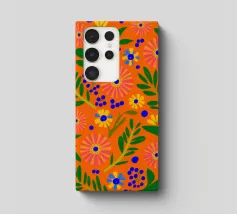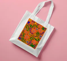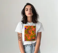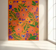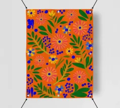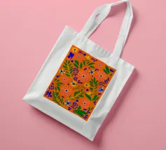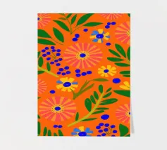 A cheerful pattern of stylized orange flowers and leaves creates a vibrant, sunny, and joyful design reminiscent of a blooming orange grove.