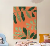 A simple yet striking pattern of various green leaf shapes scattered across a vibrant orange background. The high contrast makes the botanical forms pop, creating a fresh and modern design.