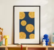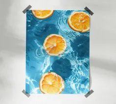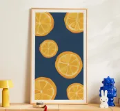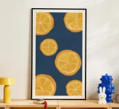 A graphic, pop art style pattern of orange slices against a dark blue background. The composition is modern, vibrant, and a fresh, zesty, and stylish design.