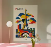 A bold, graphic tribute to Paris, reimagined through clean geometry and vibrant colour blocking. Iconic landmarks rise in layered harmony, with the Eiffel Tower at the centre, framed by stylised clouds and architectural forms that give the composition rhythm and balance. The flat shapes and confident contrasts create a timeless poster aesthetic that feels both nostalgic and unmistakably contemporary.