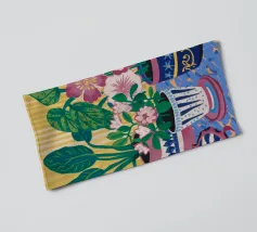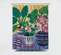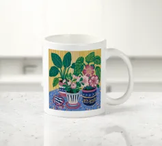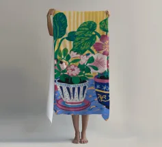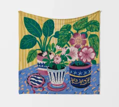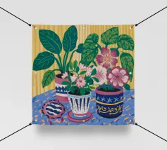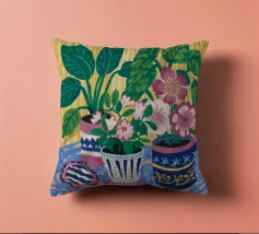 Several potted plants with vibrant flowers and leaves, in uniquely patterned pots, arranged on a surface with a patterned cloth, creating a rich textural and colorful display.