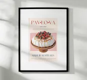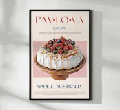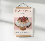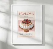 Set on a neutral, cream background, this elegant illustration of the famous dessert pavlova adds sophistication to any kitchen, cafe or dining area. This minimalist yet informative design will spark conversation in any setting, adding a refined touch to your environment.