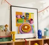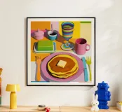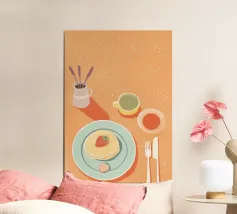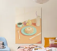 A delicious stack of golden brown pancakes, topped with a melting pat of butter and drizzled with syrup, is the star of this artwork. Presented with colorful mugs, the illustration is a mouth watering celebration of a classic, beloved breakfast treat.