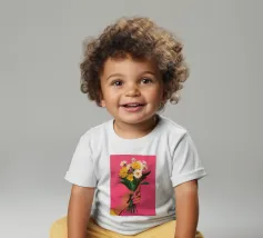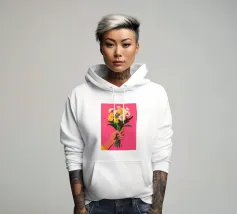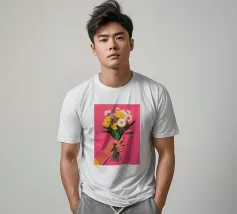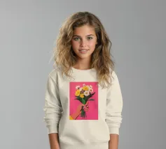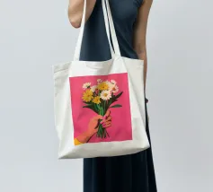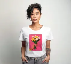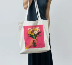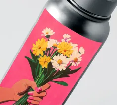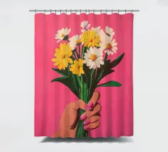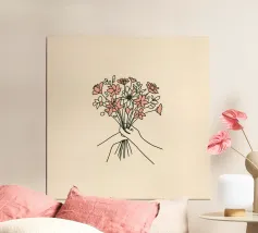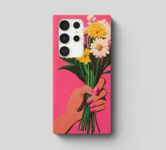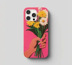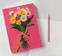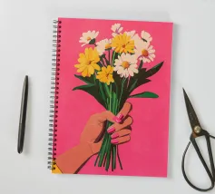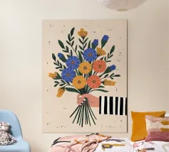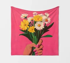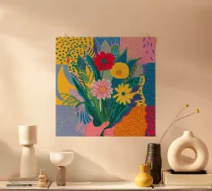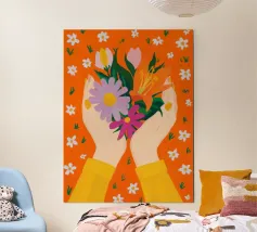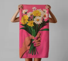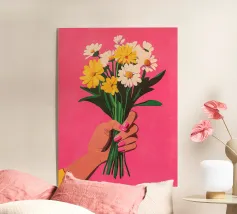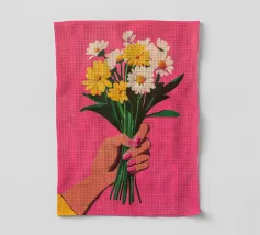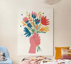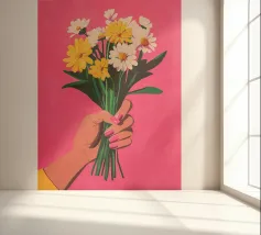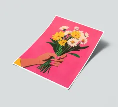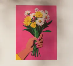 This vibrant illustration shows a female hand with pink fingernails holding a colourful bouquet of spring flowers and daisies. Perfect for Mother's Day, the artwork radiates joy and love and makes a wonderful colourful gift.