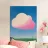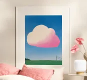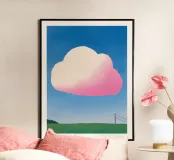 A large cloud with a gradient of white and pink hues floats serenely in a clear blue sky above a grassy landscape. Power lines stretch across the right side, adding a touch of human presence to the tranquil scene.