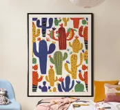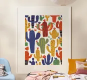 A playful and colorful pattern of various stylized cacti creates a fun, cheerful, and modern design that celebrates the quirky beauty of desert plants.